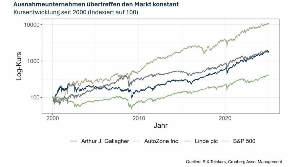 Die Unternehmen Linde, AutoZone und Arthur J. Gallagher könnten auf den ersten Blick unterschiedlicher nicht sein. Ein Industriegasunternehmen, ein Einzelhändler für Kfz-Teile und ein Versicherungsmakler – sie haben weder Produkte noch Zielgruppen gemein. Doch was sie eint, ist ihre beeindruckende Fähigkeit, langfristig und konstant zu wachsen. Das widerspiegelt sich auch in ihren Aktienkursen: Sie zeichnen sich durch einen nahezu ununterbrochenen Anstieg aus. Dabei haben auch sie Inflationsphasen, Rezessionen und andere Marktschwankungen überstanden und verdeutlichen, dass es unternehmensspezifische Erfolgsfaktoren gibt, die zu solch nachhaltigem Wachstum führen.