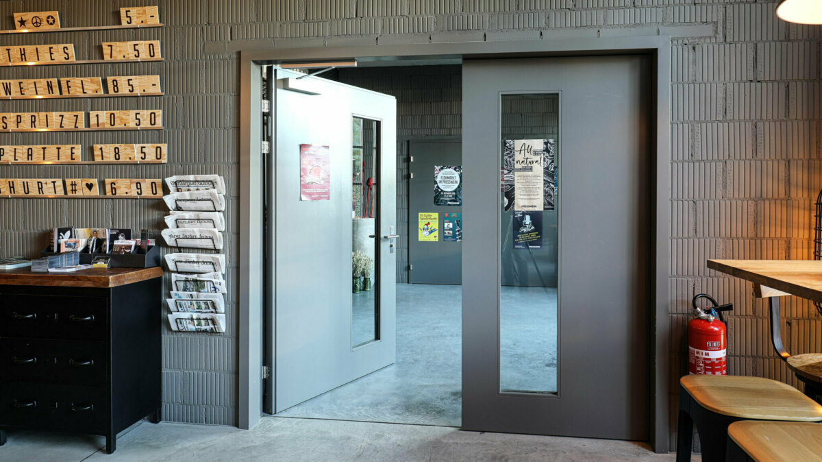 Beispiel Eventhalle Presswerk Arbon Beim Umbau des im Jahr 1910 erbauten historischen Backsteingebäudes in eine Event-Location waren verschiedenste Herausforderungen zu bewerkstelligen. Die eingesetzten Produkte reichen von SoundStar über FlamEx bis hin zu PuraPlus. Die Elemente wurden mit Spezialausstattungen wie Panikschlössern, elektronischen Türflügel-Antrieben, Schlossgarnituren sowie Glasfüllungen versehen.